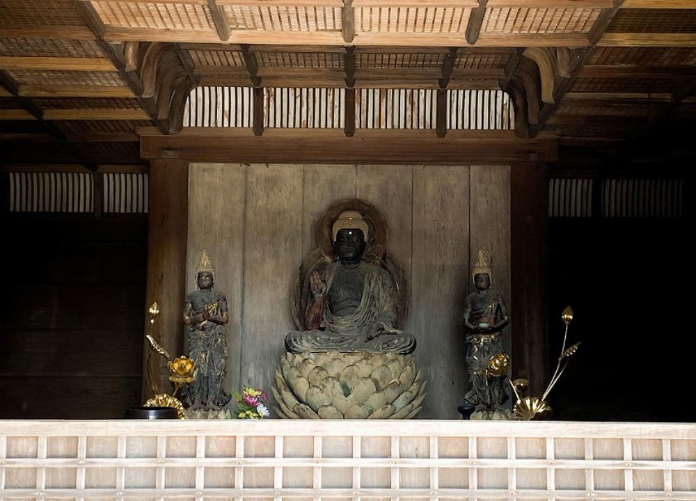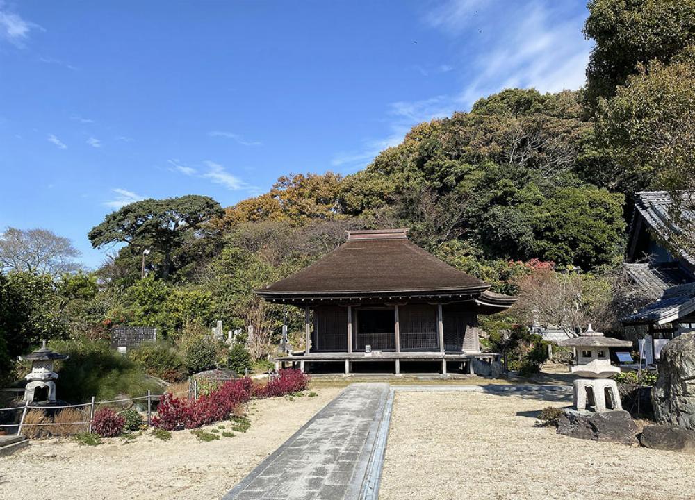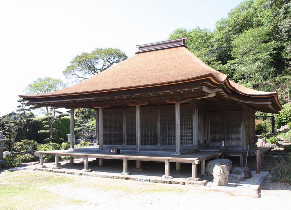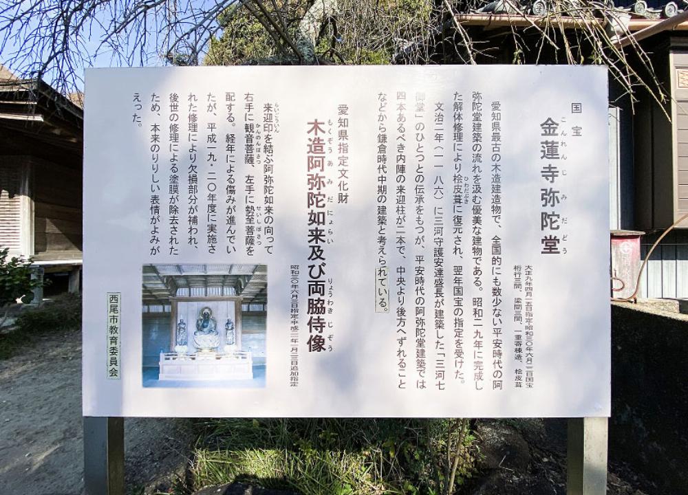 鎌倉時代に建てられた愛知県内最古の木造建造物で、小規模ながら優美な曲線を描く桧皮葺の屋根が美しい名建築です。戦後に解体修理が行われたのち、昭和29年に国宝に指定されました。お堂の中には愛知県指定文化財の木造阿弥陀如来坐像と両脇侍像が安置されています。