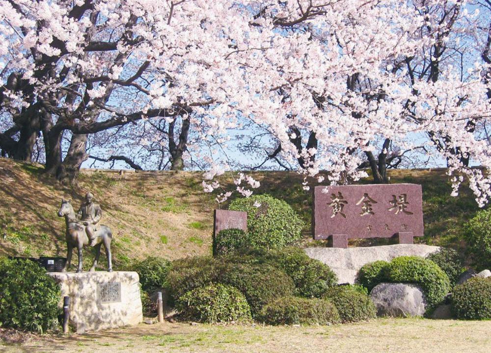 名君、吉良上野介義央公がつくった善政を象徴する堤防。桜の名所としても有名で、夜にはライトアップされ幻想的な雰囲気を醸し出します。長さ約180m、高さ4mの堤防を築き、洪水の被害に苦しむ領民を救ったと言われています。この堤防により「黄金色の稲穂」が田を彩るようになったことから「黄金堤」と呼ばれるようになりました。