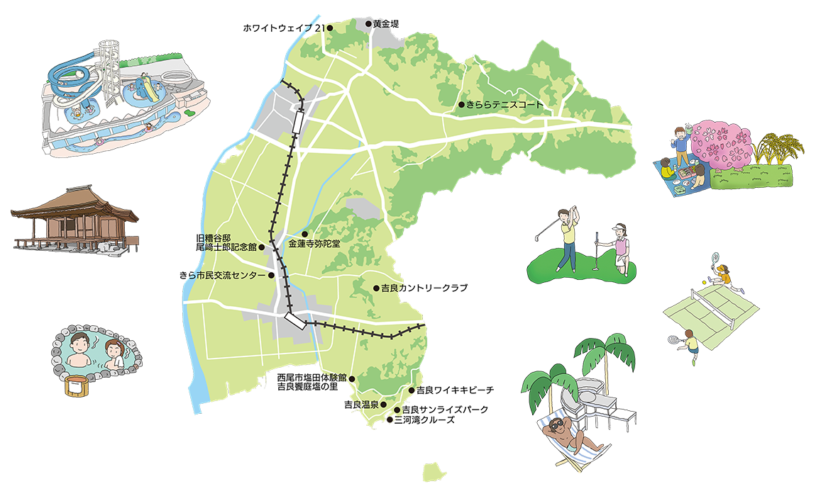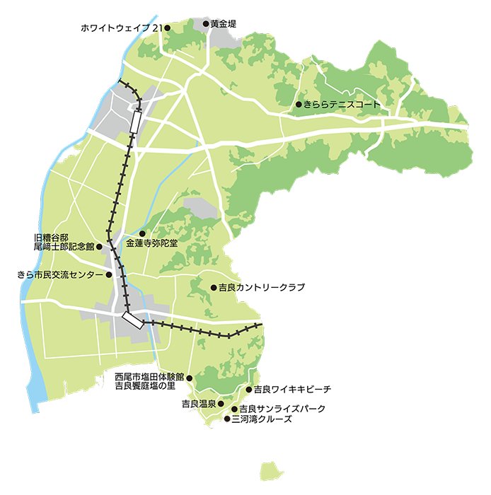 吉良町は、地域の中心を名鉄西尾線が通り、上横須賀駅と吉良吉田駅の2駅を利用できる便利なエリアです。なかでも吉良吉田駅は始発駅のため、通勤時に座れることが多く、名古屋方面への移動が快適で、負担が少ないのが魅力の1つです。