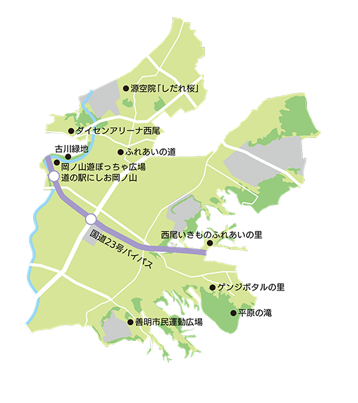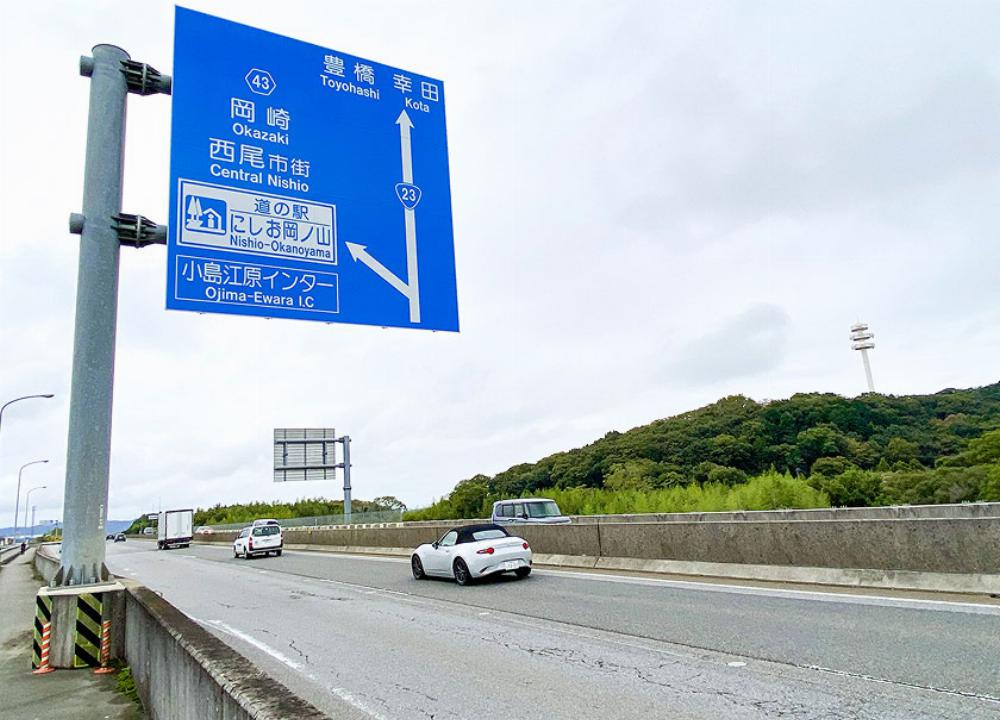 国道23号バイパスは、名古屋市と豊橋市を結び沿線の8市1町を通過する延長72.7kmの高規格道路であり、西尾市内には4つのインターチェンジがあります。このバイパス道路を使うことにより名古屋や豊橋まで約50分、東名高速道路音羽蒲郡インターチェンジまで約30分でアクセスすることができ、車での移動が便利です。