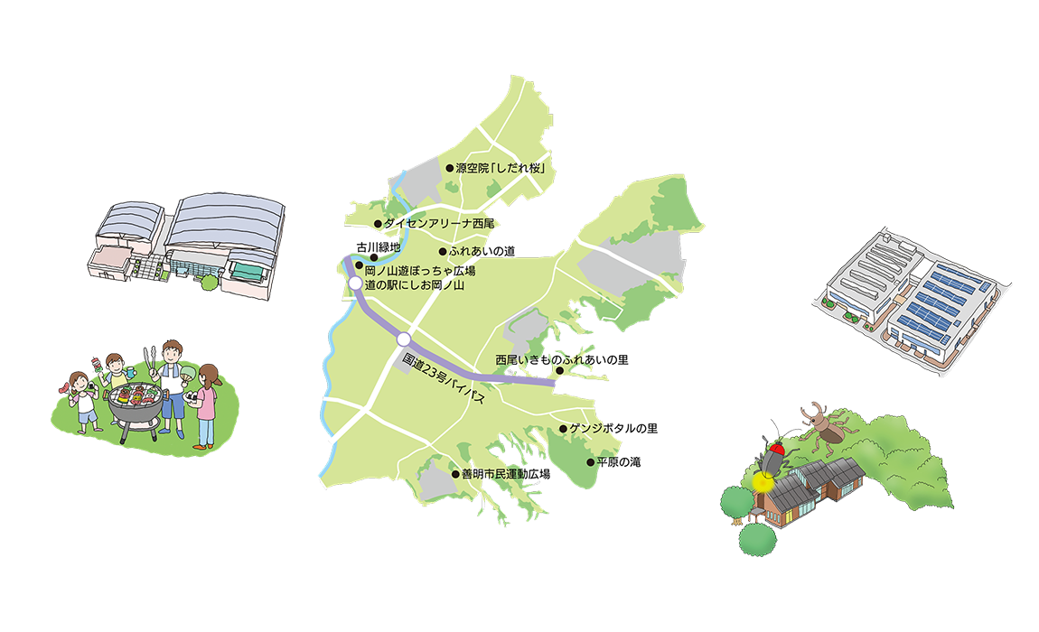 三和・室場エリアは高規格道路である国道23号バイパスを使えば、近隣市へのスムーズなアクセスが可能なことと、スポーツ施設が充実していることも魅力です。また、西尾いきものふれあいの里での四季を肌で感じる行事や、ゲンジボタルの里のホタルなど豊かな自然が身近にあり、子どもたちの五感を育む最高の環境が整っており、自然の中で伸び伸びと子育てしたい方におすすめのエリアです。