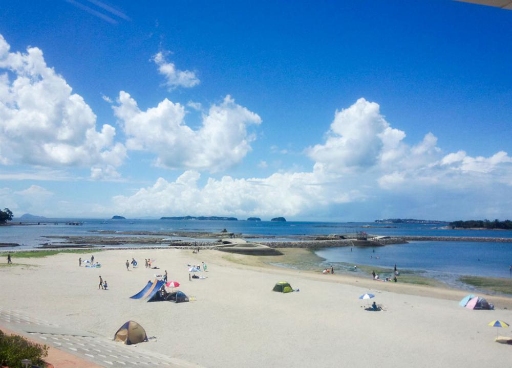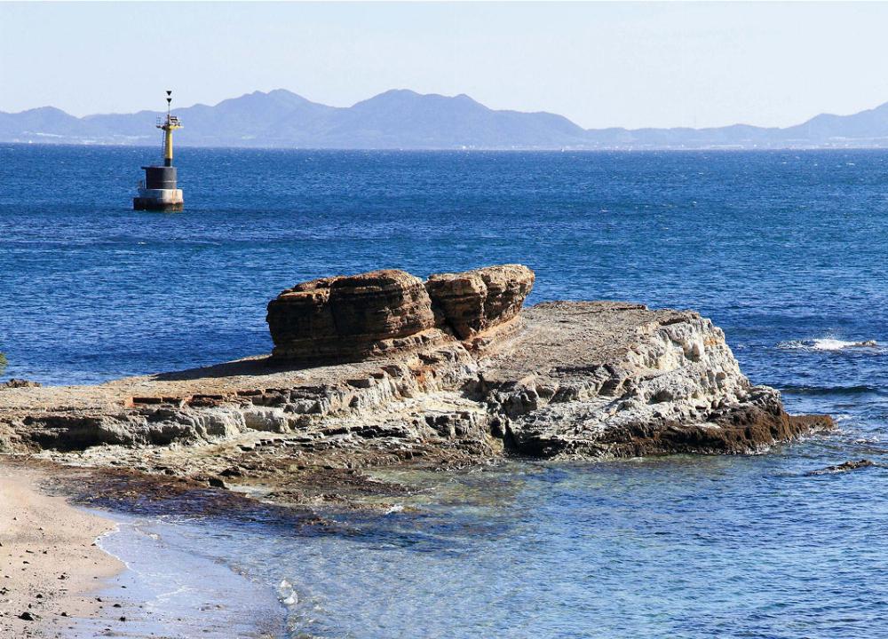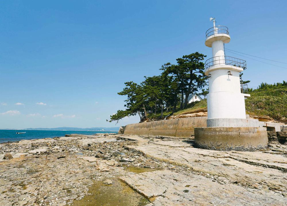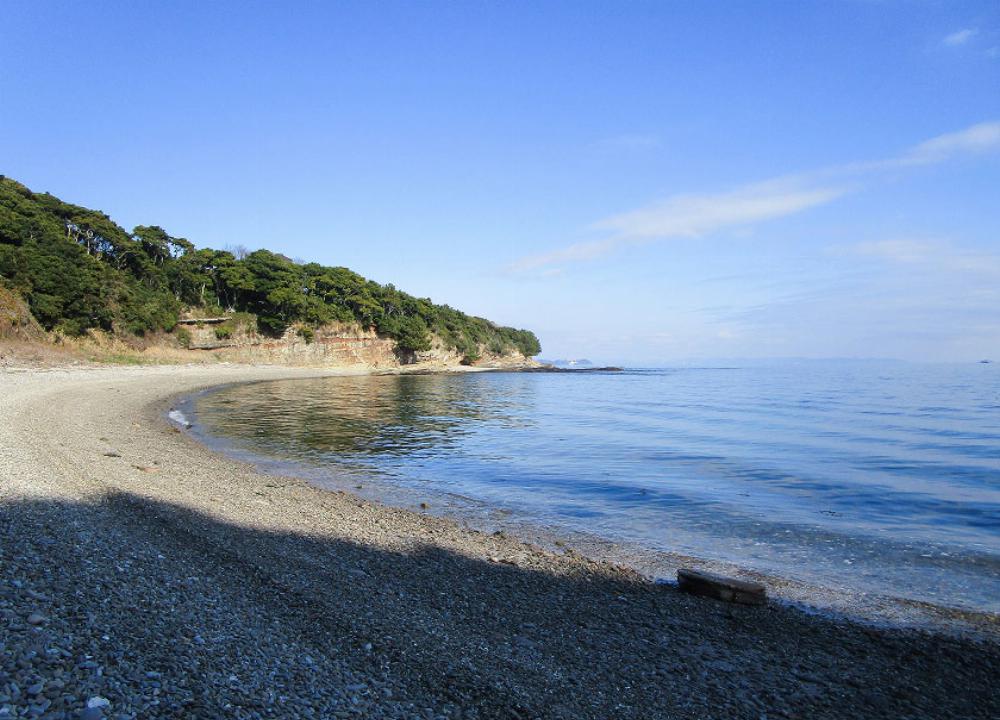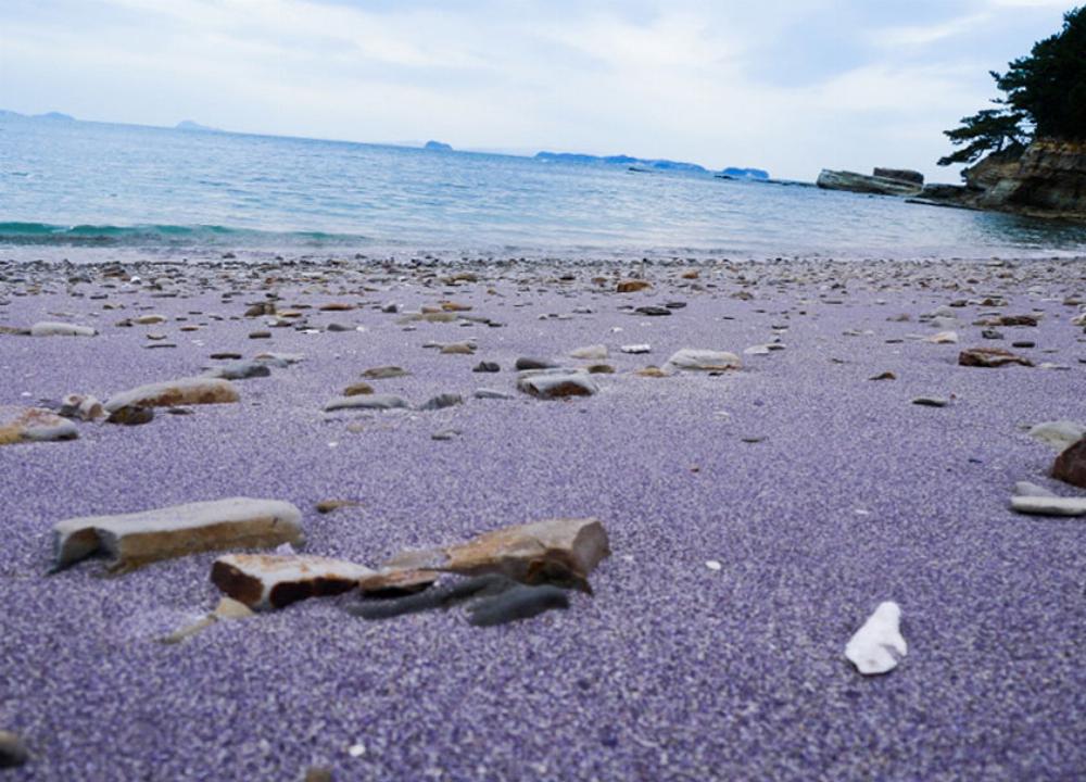 丹梨(たんなし)海岸新谷海岸は幾重にも薄く重なる地層が波間に見え隠れする美しい海岸です。 ムール貝やウチムラサキ(大あさり)のカケラが砂に混じり、ほんのり紫色を帯びた浜もロマンチックです。