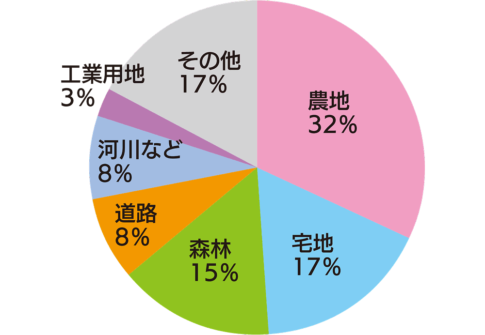 西尾市は農地が約32%、森林が約15%を占め、自然や田園風景を感じられる地域です。宅地が17%とバランスが良く、穏やかな環境と豊かな自然が調和しています。