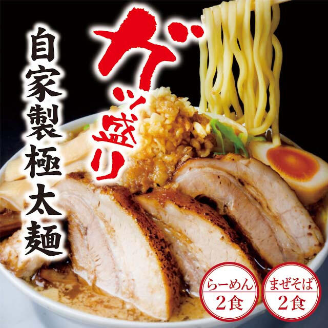 二郎インスパイア系【麺屋しずる】ガツ盛!醤油らーめん、まぜそば 4食セット・M083-13