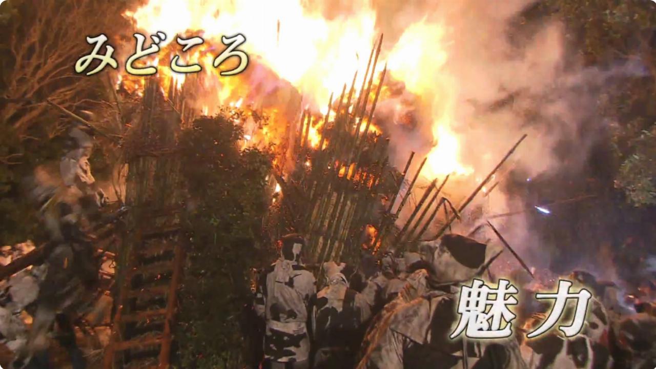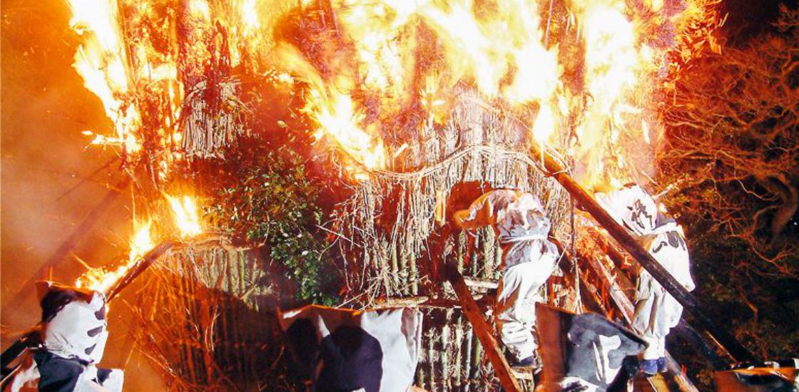 毎年2月の第2日曜日に、鳥羽町の鳥羽神明社で行われます。『すずみ』と呼ばれる高さ7m程の大松明に火がつけられ、「乾地」「福地」とふたつの地区に分かれた、神男と古いのぼりで作った装束を身に纏った奉仕者たちが燃え上がる炎の中に勇敢に飛び込み、中の『神木』と『十二縄』を取り出し、神前に奉納をします。