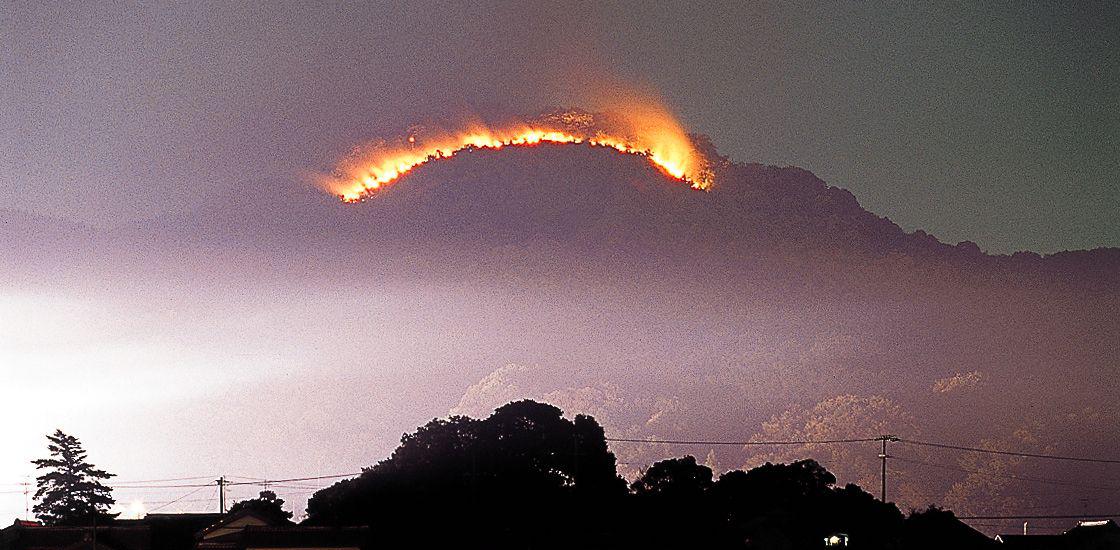 貝吹町万灯山の斜面で、350年以上前からお盆に行われている、供養の火祭り。かぎ状の炎が宵闇に浮かび上がります。