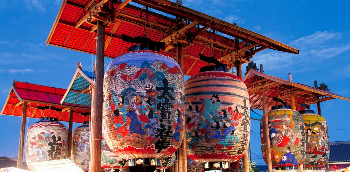 毎年8月下旬に、全長約6〜10mもある6組12張の大提灯が、三河一色諏訪神社に掲げられます。その巨大な提灯は愛知県指定有形民俗文化財となっています。海の魔物を鎮めるためにかがり火をたいたのがその起源といわれます。