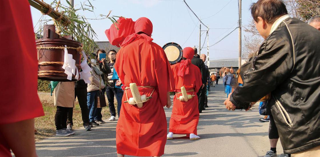 赤装束の厄男が腰に大根を結び、小気味よい太鼓のお囃子に合わせて腰を振りながら練り歩く天下の奇祭。毎年1月3日に熱池八幡社で開催され、愛知県無形民俗文化財にも指定されています。