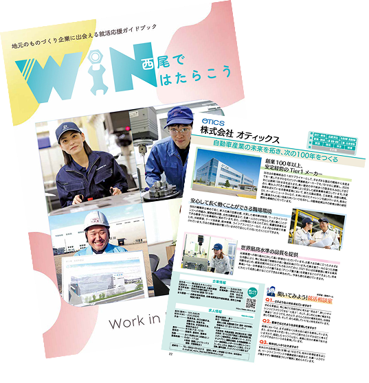 まずは市内の優良企業を紹介している「就活応援ガイドブック Work in NISHIO」と「ほんものづくり隊 in 西尾」という2冊があります。こちらから各企業の情報を見てみよう!